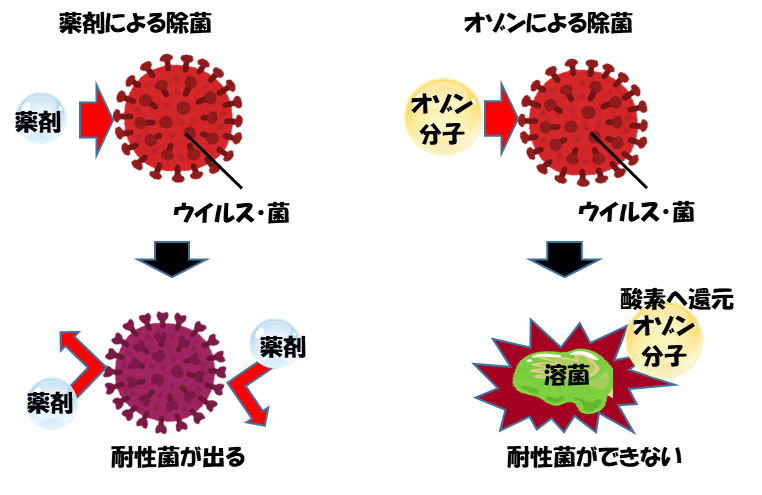 また、オゾンは物質と反応した後酸素に戻るため残留性がありませんので薬剤を使用したくない場所でも効果を発揮できます。
