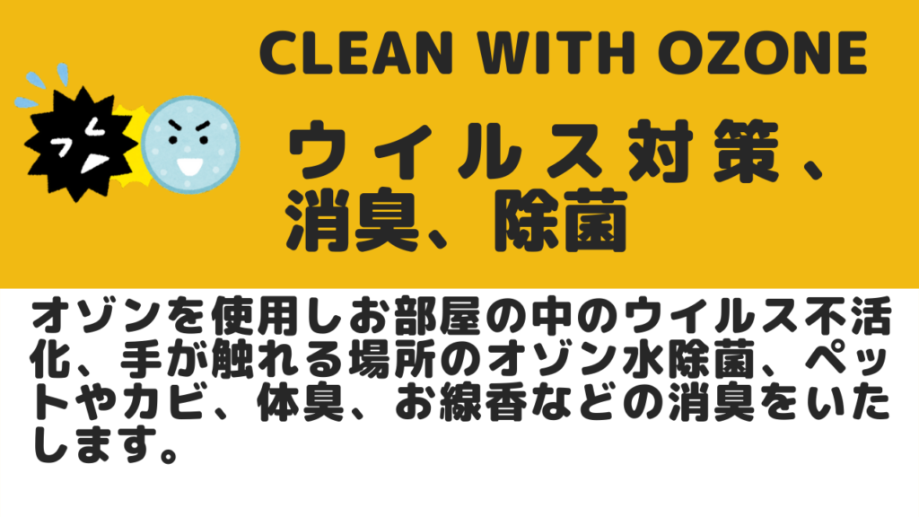 オゾンガス、オゾン水で空間や手が触れるところを除菌いたします。