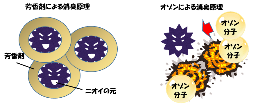 芳香剤による消臭はニオイを他のニオイで包み込んでいるため、ニオイ自体は残ったままです。
